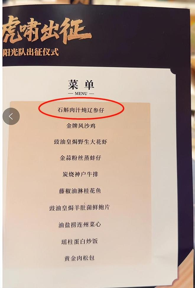 最后宏远出征仪式上的菜单,第一道菜就让大家都知道广东还是记着和老对手辽篮的恩怨的:“石斛肉汁炖辽参仔”。相信一些广东球迷都看出来了这道菜是在说谁。不过菜单没有“番薯糖水”就有点可惜。可能是朱芳雨做的菜单,杜锋看过之后把这道甜品给删掉了。