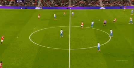 而在这段时间,曼联的进攻机会并没有很多,明显较好的一次便是库尼亚的这次攻门,过程中也可以看到作为客队的布莱顿,在压迫环节并没有投入多少精力,任由卡塞米罗一直在寻找线路和时机: